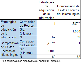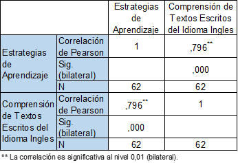 Interpretación: La matriz de correlación presenta el contraste de la hipótesis general, de variables: el coeficiente de Pearson y el nivel de significancia obtenido. Se tiene una significancia de 0.000, menor a 0.05; por lo que se rechaza la hipótesis nula, entonces, existe una relación significativa entre las variables estrategias de aprendizaje y comprensión de textos escritos del idioma inglés. Se encontró una asociación lineal estadísticamente significativa positiva considerable (r P=0.796, p <0.05).