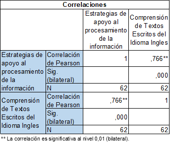 Interpretación: La matriz de correlación presenta el contraste de la hipótesis especifica 2 por pares de variables: el coeficiente de Pearson y el nivel de significancia obtenido. Se tiene una significancia de 0.000, menor a 0.05; por lo que se rechaza la hipótesis nula, entonces, existe una relación significativa entre las dimensiones estrategias de apoyo al procesamiento de la información y la variable comprensión de textos escritos del idioma inglés a través del autoconocimiento, automanejo y planificación, automanejo, regulación y evaluación, autoinstrucción, autocontrol, contra distractores, interacciones sociales, motivación intrínseca, extrínseca y motivación de escape. Se encontró una asociación lineal estadísticamente significativa moderada (r P=0.766, p <0.05).