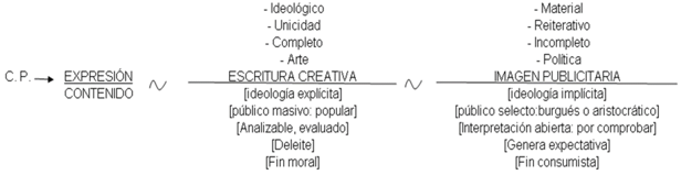 2.1. Los planos de expresión y contenido Todo elemento que se analiza desde la semiótica se origina de una toma de posición, la cual es considerada como una propioceptividad; es decir, se trata de un cuerpo propio, que por naturaleza es de índole dinámica. A su vez, sus variables dependen de dos tipos de regimientos. El primero es el exteroceptivo. Este consiste en lo que expresa esa entidad. Y el segundo es el interoceptivo. Este radica en lo que se desarrolla en el interior. De ese modo, al aunar ambas dimensiones, se obtiene un nexo semisimbólico, que será capaz de acarrear una acepción peculiar; en rigor, información del estado de las cosas. Por ejemplo, para este caso, se ha asumido como base la clasificación antagónica existente entre dos categorías: la escritura creativa a diferencia de la litografía. A partir de estas estructuras paradigmáticas, señalo los semisimbolismos que revelan un significado pormenorizado y más amplio a nivel constitutivo.