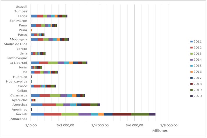 En el gráfico 1, se observa que desde el periodo 2011 a 2020, la región favorecida con la distribución de canon es Áncash, seguido de Arequipa, La Libertad, Cajamarca, Moquegua y Tacna, los detalles de las transferencias del periodo 2011 a 2020, suman un total por concepto de canon de S/. 29 265 867 080.00, con ningún presupuesto asignado o presupuesto mínimo tenemos a Ucayali, Loreto y Callao, según la tabla 1.