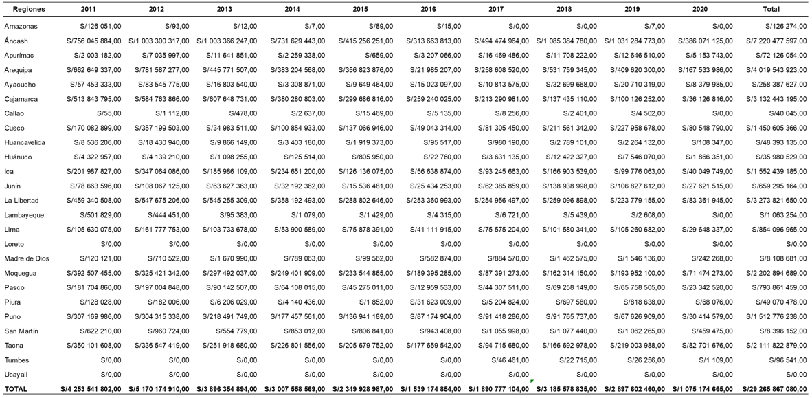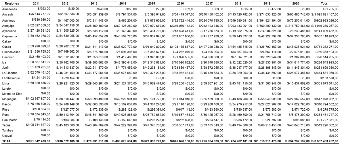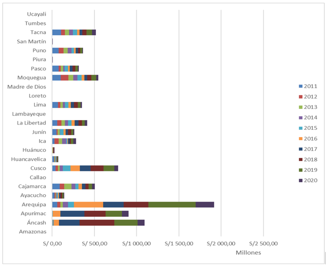 En la distribución de regalías mineras del periodo 2011 al 2020, la región favorecida fue Arequipa, seguido de Áncash, Cusco, Moquegua y Tacna, según el gráfico 2. Las regalías en este periodo sumaron un total de S/. 8 507 463 782.00, sin alcanzar ninguna asignación presupuestal las regiones de Tumbes, Ucayali, Madre de Dios, Loreto y Callao, según la tabla 2.