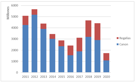 Entre los años 2011 y 2020 (abril), se recaudó por concepto de canon minero un total de S/. 29 265 867 080.00, siendo favorecida la región Áncash principalmente, sin obtener algún beneficio de este gravamen las regiones de Ucayali y Loreto.
