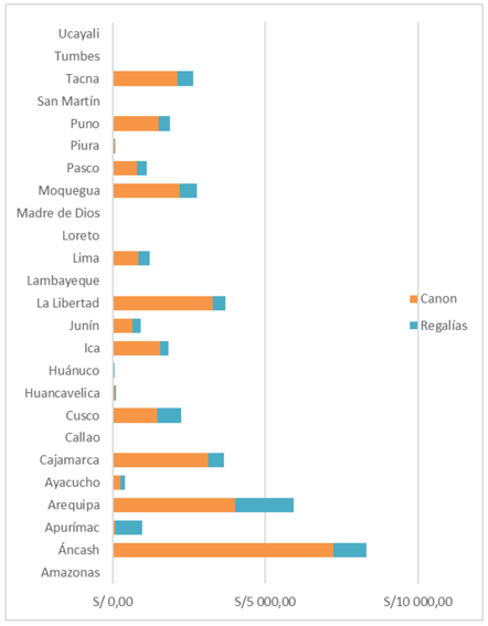 El total de lo asignado presupuestalmente entre canon y regalías mineras asciende a S/.37 773 330 862.00. Siendo Áncash la región más favorecida, seguido de Arequipa, Cajamarca, La Libertad, Tacna y Moquegua; las regiones que no cuentan o de lo contrario cuentan con menor asignación son: Ucayali, Tumbes, San Martin, Madre de Dios, Loreto, Lambayeque, Amazonas y la región constitucional de Callao, tal y como se observa en el gráfico 4.