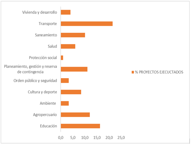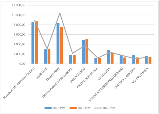 Los Gobiernos Locales han orientado sus recursos al financiamiento de los Programas Funcionales del Estado por S/. 38,223.2 millones, registrando una ejecución de S/. 10,177.7 millones y un avance del 26.6%. La Función Planeamiento, Gestión y Reserva de Contingencia ha registrado la mayor ejecución con S/. 3,497.4 millones (39.3% de avance), seguido de la Función Ambiente con S/. 1,333.2 millones (43.2 % de avance), Transportes con S/. 1,204.7 millones (11.6%), Orden Público y Seguridad con S/. 947.0 millones (44.3%), Saneamiento con S/ 648.7 millones (17.3%), Protección Social con S/. 454.5 millones (37.4%), otros. Los gobiernos locales destinan los gastos de su presupuesto PIM en los siguientes programas funcionales en el año 2020 (Congreso de la República, 2021).