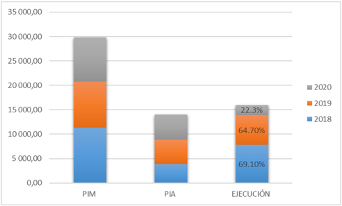 El presupuesto institucional modificado que incluye el canon, sobrecanon y demas acuerdos que recibe cada municipalidad, a nivel nacional tienen un presupuesto de S/. 38,223.2 millones, con una ejecución de S/. 10,177.7 millones, equivalente al 26.6% y su participación en el presupuesto general es del 18.9% de los recursos. También muestra la siguiente información en relación a la ejecución de gastos por fuente de financiamiento en el periodo 2018-2020, evidentemente con una ejecución que apenas bordea el 70%, lo que significa que no se utiliza el total de los recursos.