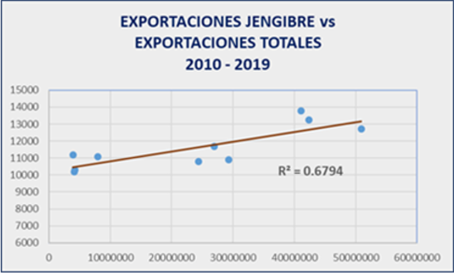 La Gráfica 9 evidencia la correlación entre la exportación de jengibre y la exportación total en el período 2010 – 2019, la línea de regresión (y = 39452 + 566.06x), con un factor de determinación R. = 0.6794, demuestra una alta relación entre variables.