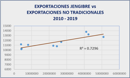 En la Gráfica 10 se aprecia la correlación entre la exportación de jengibre y la exportación de productos no tradicionales peruanas entre 2010 – 2019, esto se ve expresada en la línea de regresión (y = 9671.4 + 753.4x), con un factor de determina-ción R2 = 0.7296, que demuestra una alta relación entre variables.