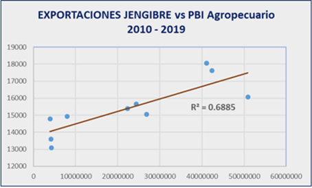 La Gráfica 11 muestra la correlación entre las exportaciones del jengibre y el PBI Agropecuario entre 2010 y 2019, ésta se ve reflejada en la línea de regresión (y = 12690 + 496.43x), con un factor de determinación R2 = 0.6885, que demuestra una alta relación entre variables.