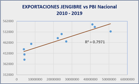 Existe muy estrecha relación entre ambas variables, de tal manera que la influencia de las exportaciones del jengibre sobre las exportaciones totales es importante.