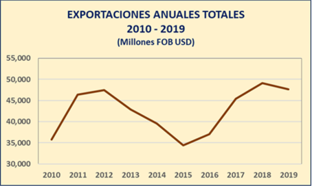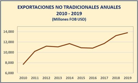 Para el 2019, las exportaciones totales fueron US$ 45,985 millones, con una caída del 4.2% respecto al 2018, debido principalmente a la caída de las exportaciones tradicionales; sin embargo, las exportaciones no tradicionales con un incremento del 4.2% alcanzaron un record histórico, superando los US$ 14 mil millones, con un crecimiento sostenido desde 2016. Estos resultados obede-cieron al buen dinamismo de las agroexportaciones, el sector pesquero y el químico.
