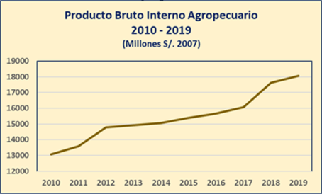 Igualmente, el desenvolvimiento de la economía nacional puede ser vista según actividad económica; para nuestro estudio, interesa mostrar, a través de la Gráfica 8, la evolución del PBI del sector agropecuario, especialmente ligado a la actividad agroexportadora, el cual nos demuestra que éste sector estratégico contribuye a la mejora de la economía nacional. Su crecimiento sostenido en la última década ha permitido un record histórico en la agroexportación durante los años 2018 y 2019, con un crecimiento anual promedio de 7,8%, la tasa más destacada, históricamente, en el comercio internacional.