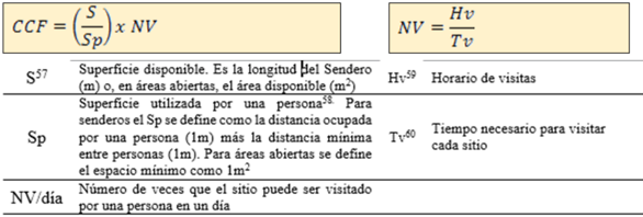 La metodología y resultado en el ítem no sufre variaciones con respecto (Cifuentes, 1999), mediante la siguiente expresión matemática: siendo el umbral máximo de visitantes por día: