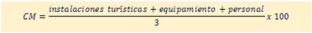 Se analiza la administración y gestión del atractivo con las siguientes variables: instalaciones, equipa-miento (cantidad, estado, localización y funcionalidad) y en personal (cantidad, conocimiento y servicio al cliente), se usó la siguiente fórmula: