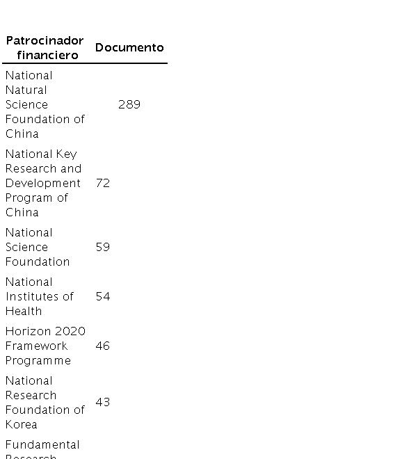 Finalmente, podemos decir que este análisis de instituciones de investigación científica de alto nivel que considera a la Academia China de ciencias con la primera en el ranking coincide con el resultado obtenido por las investigaciones de Prahani et al. y Chen y Deng. Complementariamente, en la Tabla 1 se muestra la lista de patrocinadores financieros para los trabajos de investigación, siendo la National Natural Science Foundation of China quien ocupa la primera posición con 289 investigaciones financiadas, ocupando el segundo lugar y bastante alejada de la primera, la National Key Research and Development Program of China con 72, la investigación bibliométrica realizada por Prahani et al. señala también a la National Natural Science Foundation of China como la que más proyectos de investigación ha financiado, coincidiendo.