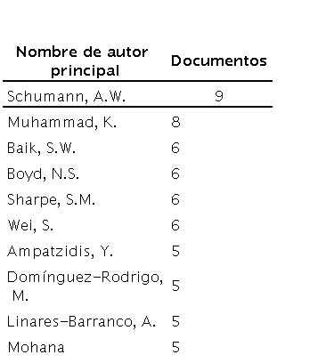 Los autores principales son aquellos investigadores que generan una mayor cantidad de literatura publicada y ejercen una mayor influencia en un campo de investigación específica. La ley de Price en bibliometría puede utilizarse para determinar el autor principal en un campo de investigación (Chen y Deng, 2020). Utilizando datos de Scopus, se muestra en la Tabla 2 el número de publicaciones de los diez autores que encabezan la lista, esta revela que Schumann, A.W., ocupa la primera posición con nueve publicaciones, siendo su artículo Deeplearning for image-based weed detection in turfgrass (Aprendizaje profundo para la detección de malas hierbas en césped basada en imágenes) del año 2019 el más citado con 134.