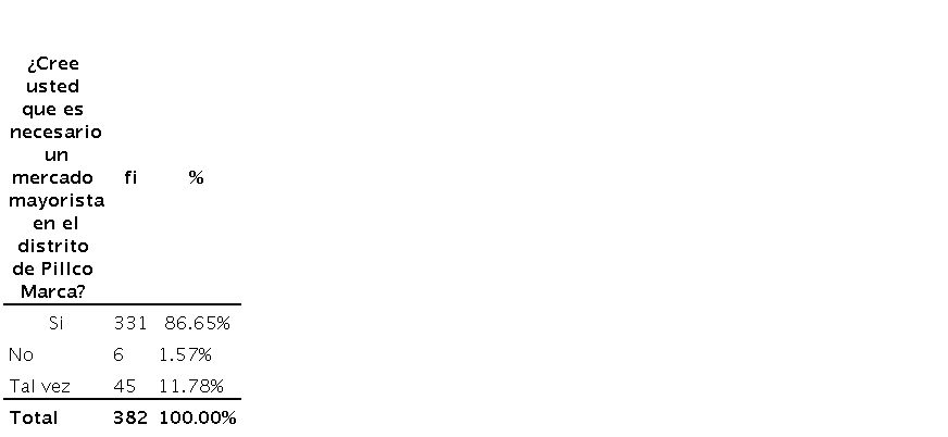 En la tabla 1 se presentan las respuestas de la población sobre la necesidad de un mercado mayorista en el distrito de Pillco Marca. De los 382 encuestados, el 86.65% (331) afirmó que es necesario, el 11.78% (45) indicó que tal vez, y el 1.57% (6) consideró que no es necesario. Estos resultados reflejan que, para la mayoría de los encuestados, es necesario contar con un mercado mayorista en el distrito de Pillco Marca.