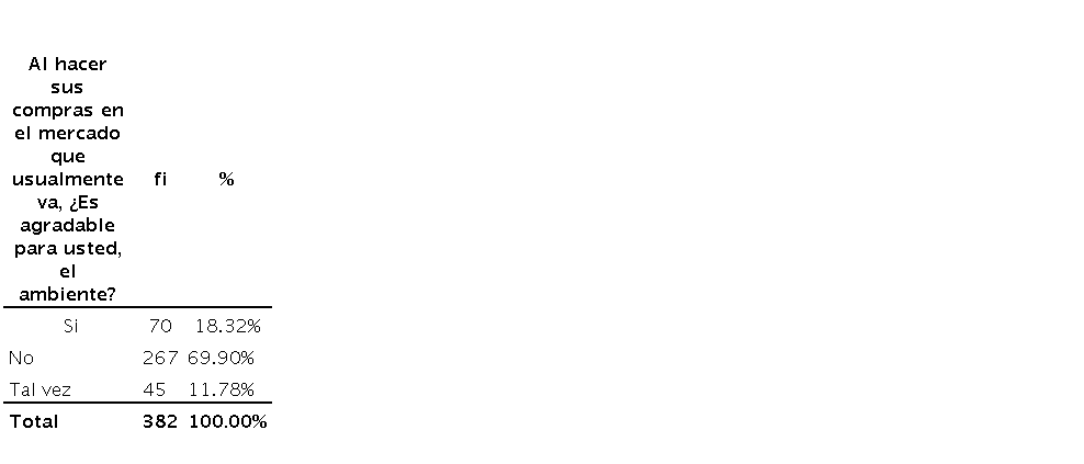 En la tabla 2 se presenta la percepción de los pobladores sobre el ambiente del mercado donde realizan sus compras. El 69.90% (267) precisó que el ambiente no es agradable, el 18.32% (70) indicó que sí es agradable, y el 11.78% (45) señaló que tal vez es agradable. Estos resultados reflejan que, para la mayoría de los encuestados, el ambiente del mercado donde suelen hacer sus compras no es agradable.