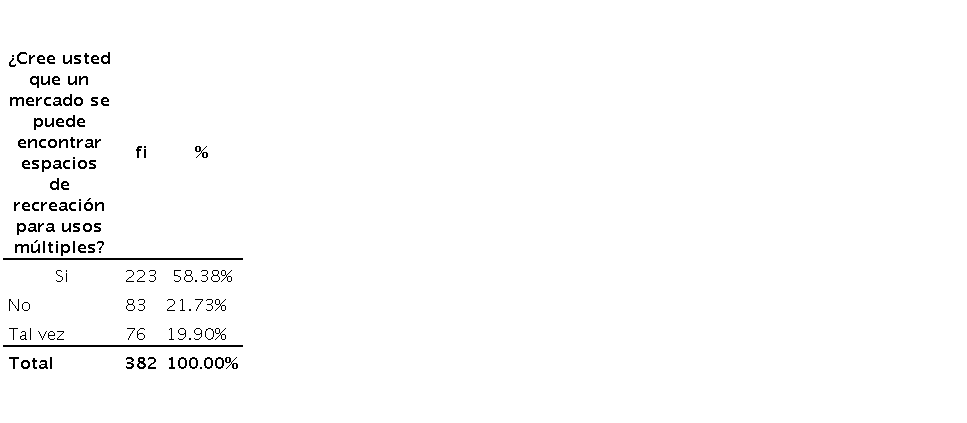 En la tabla 4 se presenta la opinión de los habitantes de Pillco Marca sobre los tipos de espacios de recreación para usos múltiples que se pueden encontrar en un mercado. De los 382 encuestados, el 53.40% (204) mencionó que pueden encontrar parques, gimnasios al aire libre, auditorios y salas de usos múltiples. El 26.70% (102) indicó que en un mercado pueden existir parques y gimnasios al aire libre, mientras que el 19.90% (76) señaló que puede haber salas de usos múltiples. Por lo tanto, la mayoría de los encuestados cree que en un mercado pueden existir parques, gimnasios al aire libre, auditorios y salas de usos múltiples.