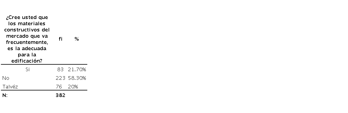 En la tabla 5 se presenta la opinión de los pobladores de Pillco Marca sobre los materiales y la edificación del mercado que frecuentan. De los 382 encuestados, el 58.38% (223) indicó que los materiales constructivos del mercado no son adecuados, el 21.73% (83) mencionó que sí son adecuados, y el 19.90% (76) expresó que tal vez lo sean. Por lo tanto, la mayoría de los encuestados considera que los materiales constructivos del mercado al que asisten no son adecuados.