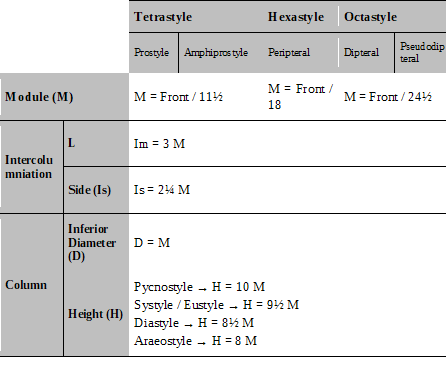 Having established the temple types, Vitruvius moves on to definition of the module that will govern the design and form the basis for the symmetria. Instead of concerning himself with detailed description of the module for all temple types, he concentrates specifically on the types that he recommends. For each one Vitruvius establishes a relationship between the dimension of the module and a fraction of the front edge of the deployed site (Vitr. De Arch. III. 3. 7). The rest of the design, including its heights, can be defined based on this initial dimension of the module, thus completing the geometric model for the temple and at the same time establishing the basis for the relations between the elements (Table 1).
