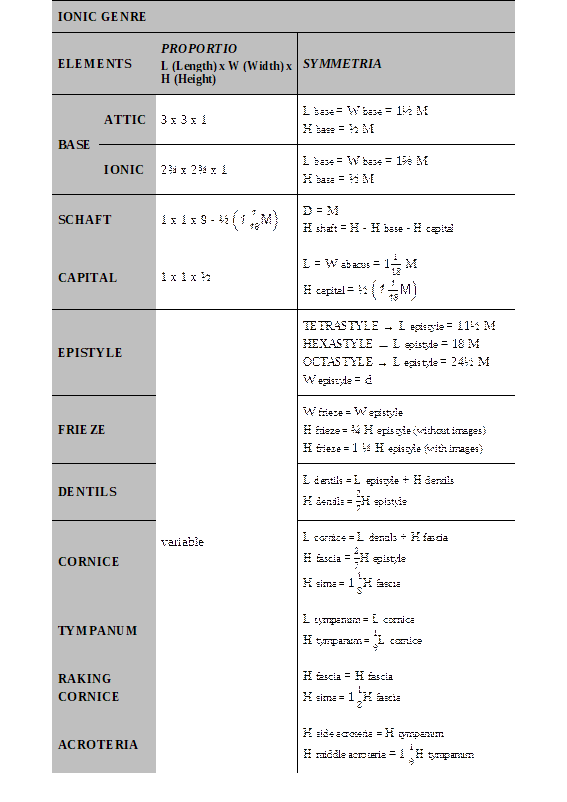 Tabulation of the descriptions reveals that the predominant relationships between the elements of the Ionic genre are modular, that is, commodulatio relationships. The elements from the base to the architrave are dimensioned initially by a relation to the general module of the design, and then the other dimensions are calculated by the particular proportio of each element. While the elements above the architrave no longer retain a direct modular relationship, since their dimensions are governed by a numerical relationship with the immediately preceding element in order of placement, to form a relationship of commensurability, or commensus.