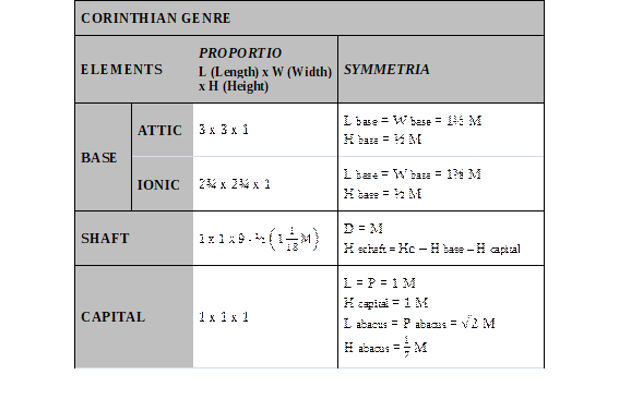 The topic of column genre continues in Book IV, with the first chapter concerned with the Corinthian. For Vitruvius, this order did not yet have well defined rules and Corinthian columns therefore follow the rules of the Ionic, differing only in terms of the capital, which is not just composed of elements that are quite different in relation to the Ionic but is also taller, thus changing the overall height relationships. The operability of the system is retained through modular relationships (commodulatio) (Table 3).