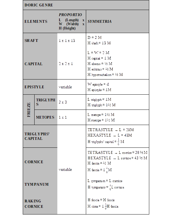 Like the Ionic, most of the relationships in the Doric order are established through module sharing (commodulatio), which establishes at least one measurement of each part, which are measured as a whole according to their internal rules of proportio. The tympanums and raking cornice are the exceptions to this rule, retaining relationships only with the preceding adjacent elements through commensurability.
