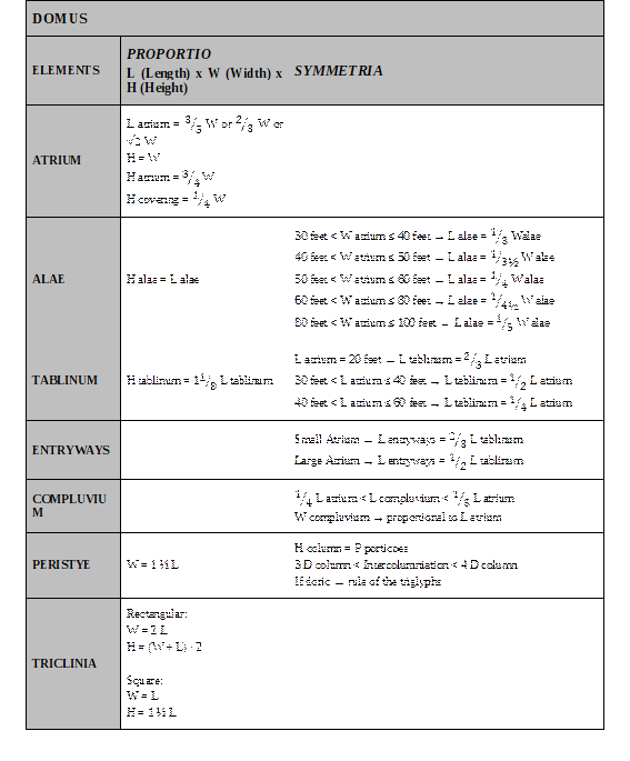 After Vitruvius’s initial recommendations and understanding that instead of house design having one single geometric configuration it is rather an arrangement of parts that have to be planned and arranged according to the climate and decor, he moves on to set out geometric schemes for each of the functional parts in isolation. He also establishes relationships between them, dealing with these functional cores also as component architectural elements of the design. He firstly describes the atrium of the Roman house, which plays a similar role to the column addressed previously, through its influence on the measurements of the other internal parts (Table 6).