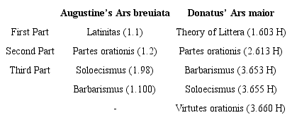 Augustine’s Ars breuiata also devotes his last part to the description and exemplification of the phenomena concerned with language correctness, but so it does exclusively with regard to solecism (soloecismus) and barbarism (barbarismus), not dealing with the so-called virtues of language, as did Donatus’ Ars maior. However, unlike the work of Donatus, Augustine provides us with a full definition of Latinitas (‘language correctness’), as we see in the comparison between the thematic structure of the Ars breuiata and the Ars maior:
