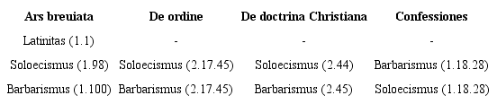 The fact that Augustine’s ars has been introduced by the definition of Latinitas and not by a reflection on the minimal sound elements of the Latin language (the ‘Littera theory’), highlights the importance of language correctness (Latinitas) within this work. Such importance is also underlined by the fact that the language deviations (the phenomena of barbarism and solecism) are also addressed in other non-grammatical works by Augustine: in the De ordine, in the De doctrina Christiana, and in the Confessions, as shown in the table below.