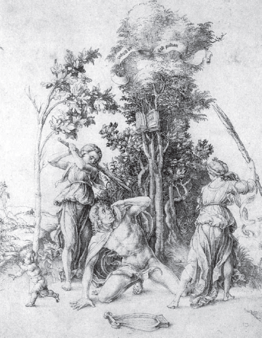 Didi-Huberman compara os frontispícios da segunda edição das Vite de Vasari e da Geschichte de Winckelmann a uma das imagens em que Warburg parece centralizar os esforços para afirmar seus conceitos: A morte de Orfeu, desenhada por Albrecht Dürer em 1494 (f. 8):