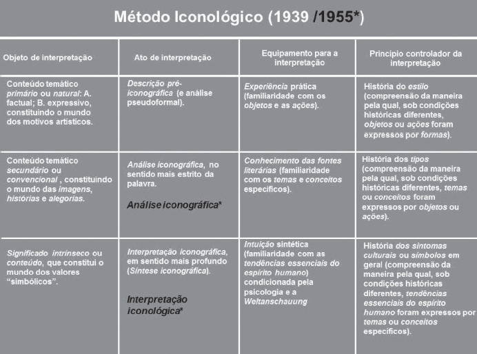 Embora não caiba discorrer sobre seu método agora, basta dizer que ele era composto de três níveis, em que, no primeiro, a “descrição pré-iconográfica”, o iconólogo deveria descrever a obra a partir de seus motivos (que ainda não poderiam ser denominados imagens), considerando em segundo plano aspectos formais (descrição pseudo-formal). No segundo, a “análise iconográfica”, ele deveria ser capaz de constituir uma cadeia iconográfica que relacionasse historicamente a obra e suas imagens (já significantes) a outras obras horizontal e verticalmente (sincrônica e diacronicamente), ou seja, a inserção da obra em um conjunto mais extenso a ela contemporânea e a percepção da obra e seu conjunto através da história, remontando os tipos iconográficos levantados até suas fontes primeiras, tarefa para a qual, frequentemente, fontes escritas eram mais que desejáveis, necessárias. O terceiro nível, que em Studies foi chamado de “síntese iconográfica” e depois, na reedição do ensaio em Meaning in Visual Arts, de 1955, de “interpretação iconológica” (Panofsky, 1986, p. 19-27; 1979, p. 45-65), permitiria ultrapassar o âmbito historiográfico-artístico da análise iconográfica e transcendê-lo sob a forma da interpretação de seus símbolos em sentido cada vez mais profundo, utilizando-se, em parte, do conceito de formas simbólicas, cunhado pelo filósofo alemão ernst Cassirer (1874-1945), que também frequentou o instituto.