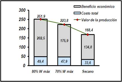 La Figura 1 refleja el ingreso neto resultante de la aplicación del riego. Se observa que al garantizar la máxima demanda hídrica del cultivo durante todo su ciclo se obtiene el mayor beneficio económico lo cual está dado tanto por el incremento de los rendimientos como por una mejor composición de calidades, sin embargo, la aplicación del riego limitado e incluso la producción en condiciones de secano produce también resultados satisfactorios, resultado que se justifica por la capacidad de este cultivo de resistir períodos de sequía y su baja evapotranspiración, así como por las condiciones climáticas del país que garantizan un alto régimen de precipitaciones durante varios meses del año (Bonet y Guerrero, 2016).