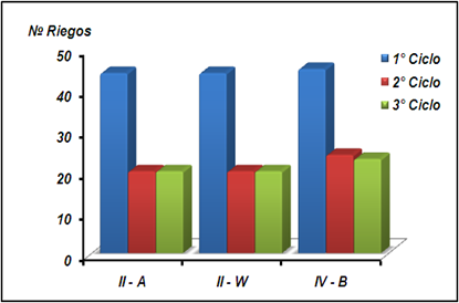 El número de riegos calculado para la garantía de la demanda de agua de la piña en los tres ciclos osciló entre 89 y 95 para los tres tipos de suelos predominantes en las áreas dedicadas al cultivo (Figura 2).