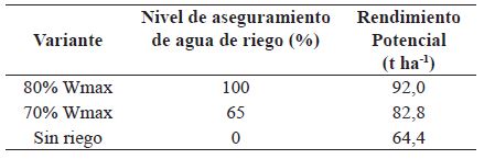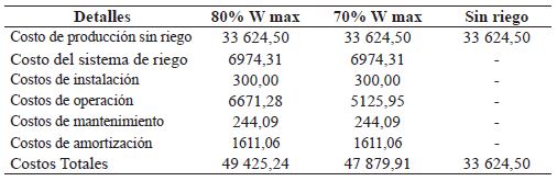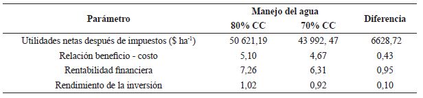Para la determinación del impuesto sobre utilidades se utilizó un índice de 0,75 (ONAT (Oficina Nacional Administración Tributaria), 2012). Los resultados confirman la efectividad económica de la respuesta del cultivo al riego; en las dos alternativas de manejo del agua los resultados son satisfactorios, pero se observa que al garantizar la máxima demanda hídrica del cultivo durante todo su ciclo se obtiene el mayor beneficio económico.