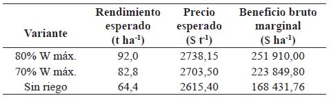 En la Tabla 3 se refleja el Beneficio bruto marginal en diferentes alternativas de manejo del riego.