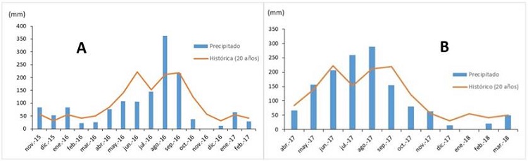 En el estudio, para el periodo de desarrollo de la caña planta de 18 meses (octubre 2015-marzo 2017), precipitaron 1421,5 mm distribuidos en 92 eventos, este valor total de lluvias fue un 10% inferior al promedio histórico. Para el primer retoño (abril 2017- marzo 2018) precipitaron 1362 mm en 77 eventos, con 28 mm menos con respecto al histórico.