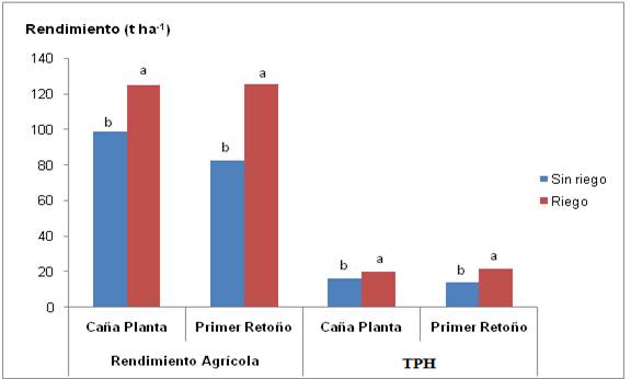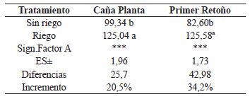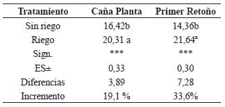 Se observan diferencias altamente significativas entre el riego y secano para las dos épocas analizadas, con incrementos en el rendimiento de 34,2% cuando se regó en el primer retoño, superior a caña planta que alcanzó el 20,5%.