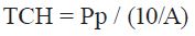 TCH- Toneladas de caña por hectáreas.Pp- Peso de la parcela (kg);A- Aérea de la parcela en m2;10- Índice de conversión de kg a toneladaPara el cálculo de las toneladas de Pol por hectárea (TPH) fue necesario relacionar el rendimiento agrícola en toneladas de caña por hectárea (TCH) y el porcentaje de Pol en caña a través de la expresión siguiente:
