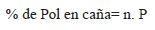 Para la determinación del porcentaje de pol en caña se consideró el resultado del muestreo y análisis azucarero final previo a la cosecha, para el cual se tomó una muestra de 1m de caña por cada parcela, por cada réplica y por cada cultivar, o sea se tomaron tres muestras por cultivar y se analizaron en el laboratorio del propio centro, las lecturas de Brix con el refractómetro de mesa y un valor en el polarímetro permitió buscar el porcentaje de Pol en jugo a través de la tabla polarimétrica y este valor nos permitió calcular el porcentaje de Pol en caña a través de la expresión siguiente: