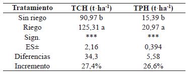 En la Tabla 1 se muestra la comparación entre los tratamientos de secano y riego para las variables rendimiento agrícola o toneladas de caña por hectárea (TCH) y toneladas de Pol por hectárea (TPH) como promedio de las dos épocas. Se observan diferencias altamente significativas entre el riego y secano para las dos variables analizadas. En la misma puede apreciarse que el riego incrementó el rendimiento en TCH y TPH en más del 25%. Estos resultados confirman, una vez más, que la caña es una planta de regadío enfatizando lo señalado por Don Alvaro Reynoso en uno de los primeros ensayos científicos sobre el cultivo de la caña de azúcar en Cuba en 1862 (Martín et al., 1987).