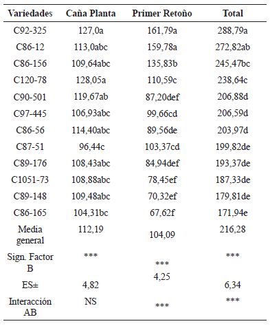 En la Tabla 2 y 3 se resume la comparación de los valores del rendimiento agrícola, para los dos factores estudiados: Factor (A) riego y sin riego, Factor (B) las 12 variedades, en las dos épocas estudiadas (caña planta y primer retoño) y el total, mostrando diferencias altamente significativas en los dos factores (A y B). En la época caña planta no hay diferencias significativas entre replicas ni entre las interacciones de los tratamientos con riego y sin riego con las variedades, por lo que solo se comparan las medias de los efectos principales, según criterios de Ruesga et al. (2005).