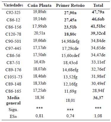 Los cultivares estudiados mostraron en general diferencias significativas en el rendimiento tanto en caña planta como en retoño. Las mejores variedades rindieron como promedio del total de las dos épocas 261,4 t ha-1 (C92-325, C86-12, C86-156 y C120-78), mientras que las de peor comportamiento (C89-176, C1051-73, C89-148, C86-165) solo alcanzaron el 29,9 % de las primeras.