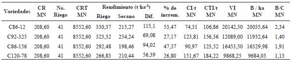 Los cultivares de mejor respuesta en rendimiento agrícola (TCH) y al contenido azucarero (TPH) bajo riego en las dos épocas estudiadas resultaron ser C86-12, C86-156, C92-325 y C120-78, con TCH entre 238-288 t ha-1, TPH entre 39-47 t ha-1 y relaciones beneficio costo de entre 1,13 y 2,34.