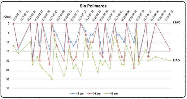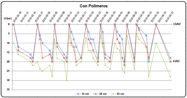 En la Figura 2, tratamiento sin polímeros ocurre algo similar, el contenido de agua en el suelo se mantuvo entre el LSAD y el LIAD. En valores de tensión también a la profundidad de 0,30m la humedad en el suelo estuvo en tensiones entre 0 y 20 kPa. Para dicho tratamiento se ejecutaron 13 riegos con norma parcial neta de 246,0 m3 ha-1 y norma total de 3198,0 m3 ha-1, el intervalo de riego promedio fue de 4 días.