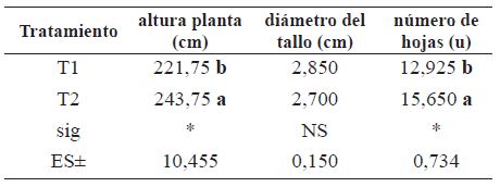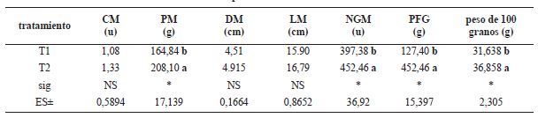 En cuanto a los componentes del rendimiento se encontraron diferencias significativas en el peso de la mazorca, número de granos por mazorcas, peso fresco de los granos y peso de 100 granos a favor del tratamiento 2, lo que condujo a un incremento del rendimiento en 14%.