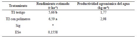 Con los valores mostrados en la tabla 3 se puede apreciar que con la aplicación de polímeros súper absorbentes se logra un rendimiento estimado de 6,59 t ha-1, superior en 0,93 t ha-1 al testigo, mostrando su posible aplicabilidad en las condiciones de la agricultura cubana.