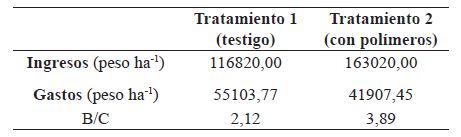 Al analizar la pertinencia de la utilización del polímero para las condiciones de estudio se muestra en la tabla 4, que con la aplicación del hidrogel se logra una mejor relación beneficio-costo con respecto al tratamiento sin hidrogel lo que confirma desde el punto de vista económico la viabilidad de su utilización.