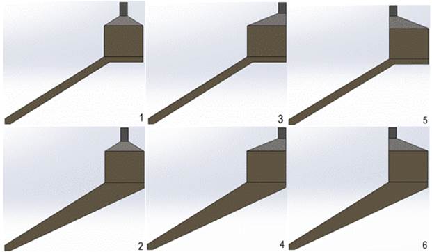 La utilización de colectores solares térmicos integrados a secadores solares de productos agrícolas es cada vez más común. En la tabla 1 se detallan las partes del secador con las características de los materiales empleados en la simulación. Inicialmente se determinó la geometría de las variantes de estudio con el objetivo de determinar la más óptima, en la Figura 1 se observa una vista isométrica de las seis variantes a analizar con las principales dimensiones.