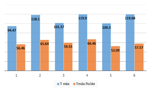 Una vez realizada la simulación para cada variante se seleccionaron los datos de temperatura máxima de los sólidos (Tmáx) y la temperatura máxima del fluido (Tmáx Fluido) caloportador (aire). Al realizar una comparación entre las variantes se puede observar que las variantes 2, 4 y 6 alcanzan como mínimo 18 por encima de las variantes 1, 3 y 5 llegando hasta los 119,9 en la variante 4. Al analizar el comportamiento (Tmáx fluido) las variantes que logran las temperaturas más altas son las 2 y la 4 superando esta última los 66 . Estos resultados demuestran que al emplear el colector con la abertura de salida igual a la abertura de entrada de la cámara de secado se logran temperaturas más altas y una mejor distribución de las mismas en la cámara de secado, como se puede observar en la Tabla 2
